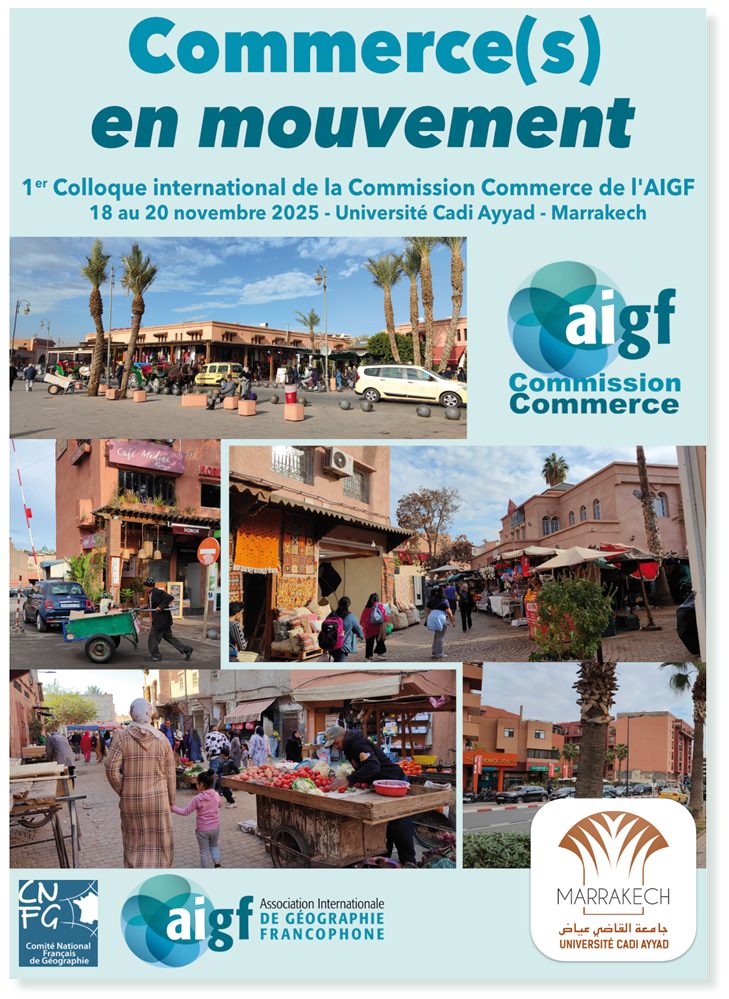 Le colloque « Commerce(s) en mouvement » aura lieu à l’université Cadi Ayyad de Marrakech, du 18 au 20 novembre 2025. Il s’agit du 1er colloque international organisé par la Commission Commerce de l’Association Internationale de Géographie Francophone. Il est soutenu par la Commission Commerce, Consommation et Territoire du Comité National Français de Géographie.
