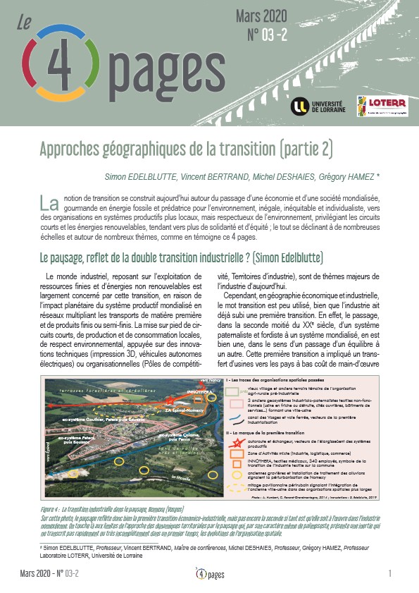 La notion de transition se construit aujourd’hui autour du passage d’une économie et d’une société mondialisée, gourmande en énergie fossile et prédatrice pour l’environnement, inégale, inéquitable et individualiste, vers des organisations en systèmes productifs plus locaux, mais respectueux de l’environnement, privilégiant les circuits courts et les énergies renouvelables, tendant vers plus de solidarité et d’équité ; le tout se déclinant à de nombreuses échelles et autour de nombreux thèmes, comme en témoigne ce 4 pages.