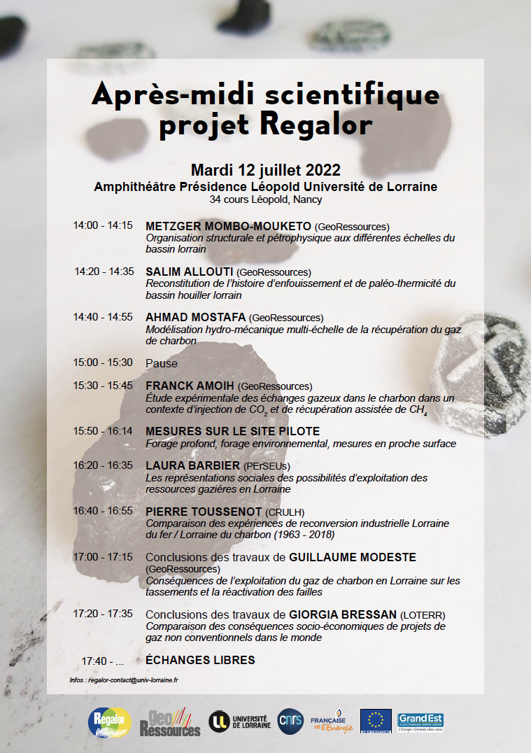 La quatrième demi-journée scientifique du projet Regalor, portant sur l’exploitabilité du gaz de charbon en Lorraine, a eu lieu le 12 juillet à partir de 14h à la présidence Léopold de l’Université de Lorraine. L’occasion de revenir sur les avancées techniques sur le site pilote de Folschviller et les avancées scientifiques des quatre doctorants et quatre post-doctorants de ces six derniers mois.
