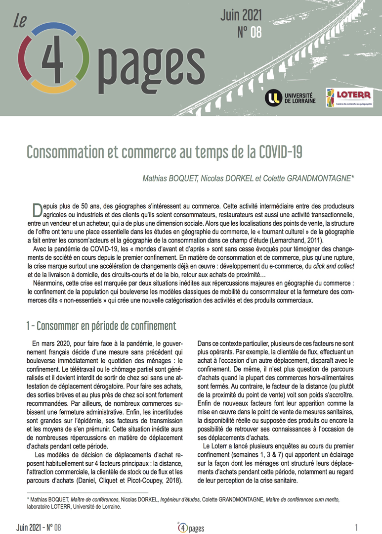 Depuis plus de 50 ans, des géographes s’intéressent au commerce. Cette activité intermédiaire entre des producteurs agricoles ou industriels et des clients qu’ils soient consommateurs, restaurateurs est aussi une activité transactionnelle, entre un vendeur et un acheteur, qui a de plus une dimension sociale. Alors que les localisations des points de vente, la structure de l’offre ont tenu une place essentielle dans les études en géographie du commerce, le « tournant culturel » de la géographie a fait entrer les consom’acteurs et la géographie de la consommation dans ce champ d’étude (Lemarchand, 2011). Avec la pandémie de COVID-19, les « mondes d’avant et d’après » sont sans cesse évoqués pour témoigner des changements de société en cours depuis le premier confinement. En matière de consommation et de commerce, plus qu’une rupture, la crise marque surtout une accélération de changements déjà en œuvre : développement du e-commerce, du click and collect et de la livraison à domicile, des circuits-courts et de la bio, retour aux achats de proximité… Néanmoins, cette crise est marquée par deux situations inédites aux répercussions majeures en géographie du commerce : le confinement de la population qui bouleverse les modèles classiques de mobilité du consommateur et la fermeture des commerces dits « non-essentiels » qui crée une nouvelle catégorisation des activités et des produits commerciaux.