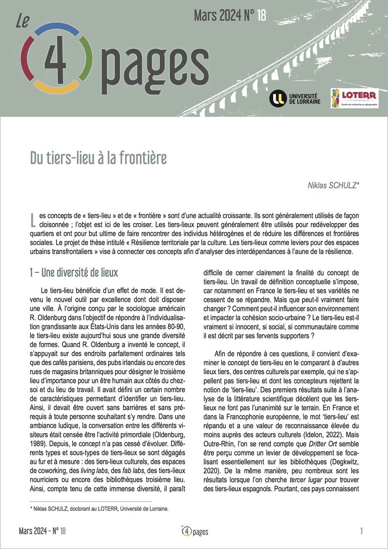 Les concepts de « tiers-lieu » et de « frontière » sont d’une actualité croissante. Ils sont généralement utilisés de façon cloisonnée ; l’objet est ici de les croiser. Les tiers-lieux peuvent généralement être utilisés pour redévelopper des quartiers et ont pour but ultime de faire rencontrer des individus hétérogènes et de réduire les différences et frontières sociales. Le projet de thèse intitulé « Résilience territoriale par la culture. Les tiers-lieux comme leviers pour des espaces urbains transfrontaliers » vise à connecter ces concepts afin d’analyser des interdépendances à l’aune de la résilience.
