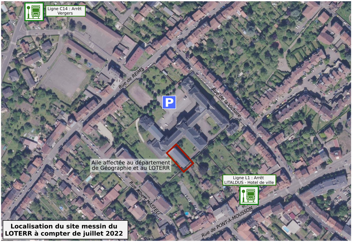 En raison des travaux qui vont débuter au mois de septembre dans le bâtiment de l’UFR SHS sur l’île du Saulcy à Metz, le site messin du LOTERR change d’adresse. Vous nous trouverez dorénavant, et pour une durée de 4 ans, dans les locaux de l’INSPE de Metz-Montigny.