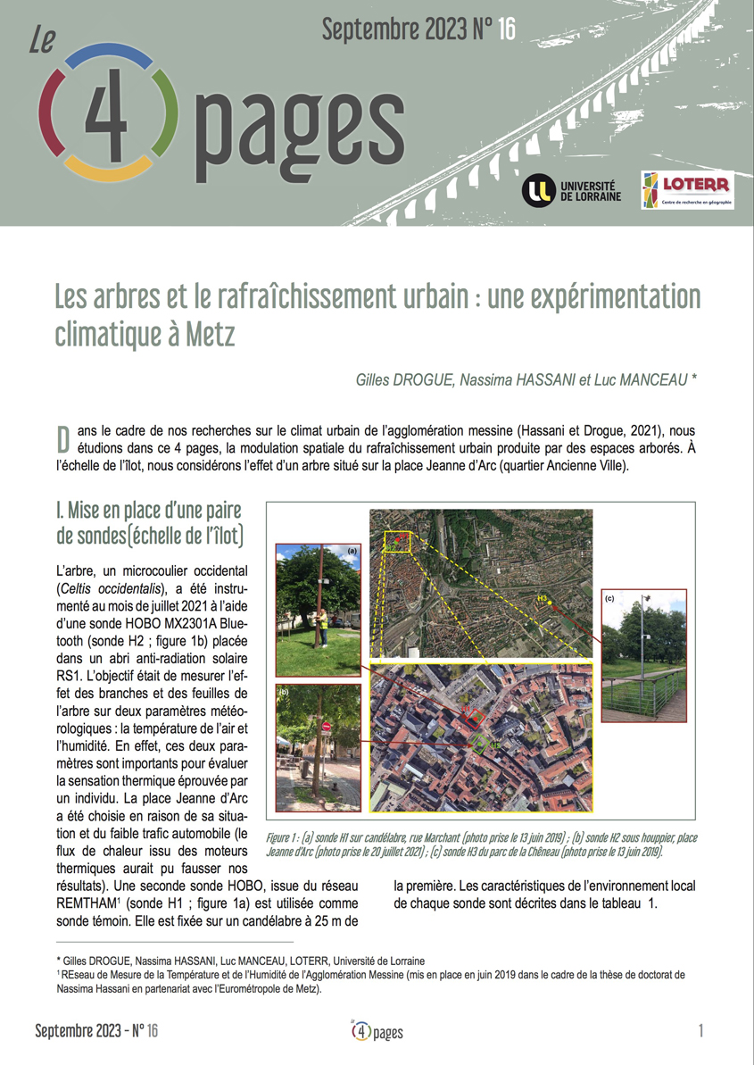 Dans le cadre de nos recherches sur le climat urbain de l’agglomération messine (Hassani et Drogue, 2021), nous étudions dans ce 4 pages, la modulation spatiale du rafraîchissement urbain produite par des espaces arborés. À l’échelle de l’îlot, nous considérons l’effet d’un arbre situé sur la place Jeanne d’Arc (quartier Ancienne Ville).