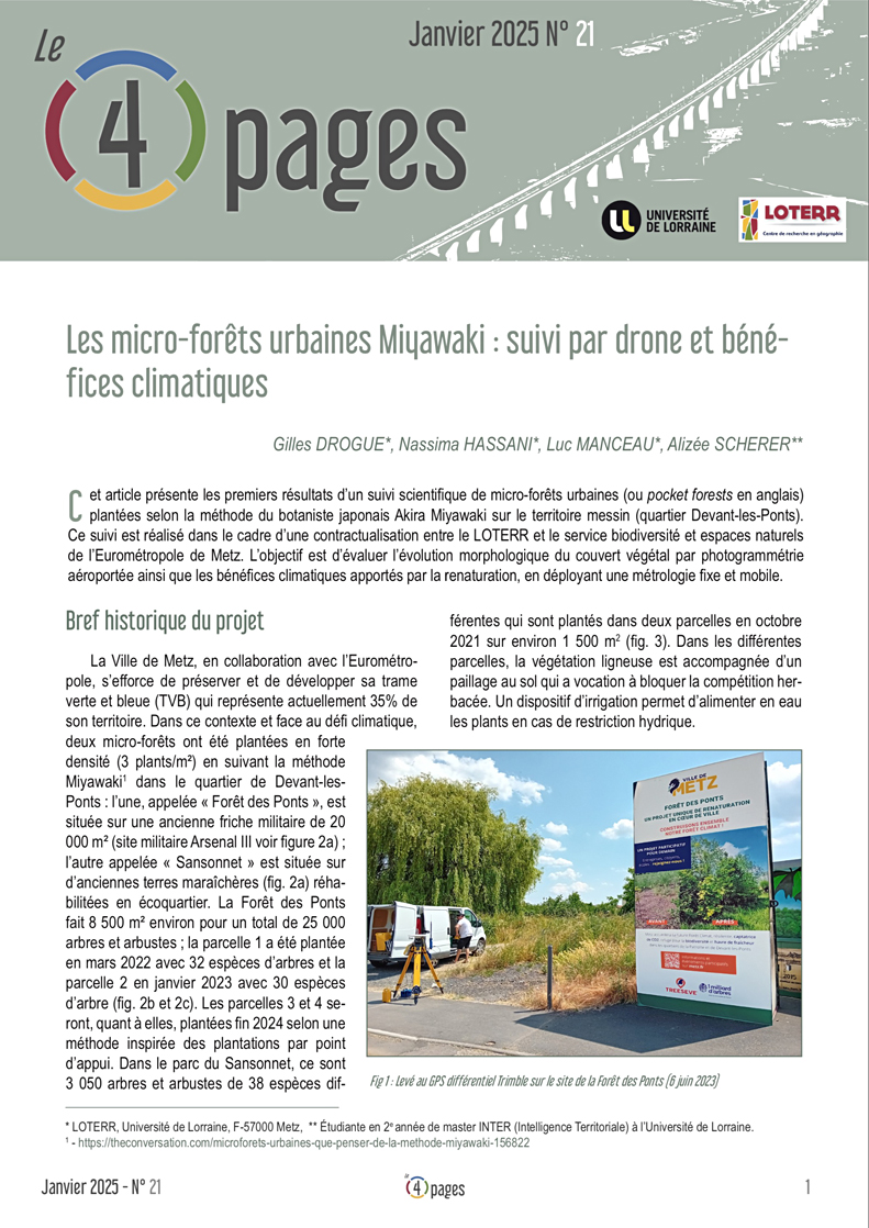 Cet article présente les premiers résultats d’un suivi scientifique de micro-forêts urbaines plantées selon la méthode du botaniste japonais Akira Miyawaki sur le territoire messin (quartier Devant-les-Ponts). Ce suivi est réalisé dans le cadre d’une contractualisation entre le LOTERR et le service biodiversité et espaces naturels de l’Eurométropole de Metz. L’objectif est d’évaluer l’évolution morphologique du couvert végétal par photogrammétrie aéroportée ainsi que les bénéfices climatiques apportés par les arbres, en déployant une métrologie fixe et mobile.