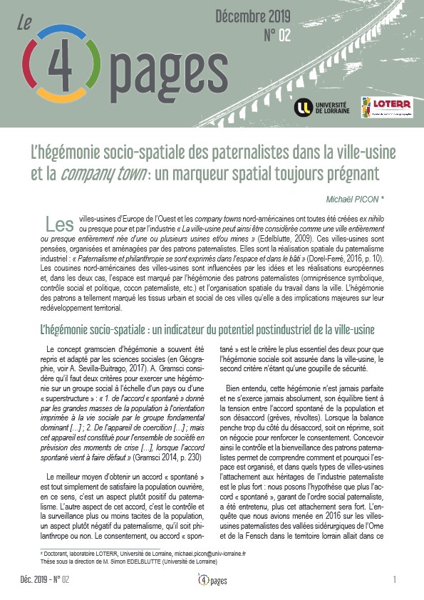Les villes-usines d’Europe de l’Ouest et les company towns nord-américaines ont toutes été créées ex nihilo ou presque pour et par l’industrie. Ces villes-usines sont pensées, organisées et aménagées par des patrons paternalistes. Elles sont la réalisation spatiale du paternalisme industriel. Les cousines nord-américaines des villes-usines sont influencées par les idées et les réalisations européennes et, dans les deux cas, l’espace est marqué par l’hégémonie des patrons et l’organisation spatiale du travail. Celle-ci a tellement marqué les tissus urbain et social de ces villes qu’elle a des implications majeures sur son redéveloppement territorial.
