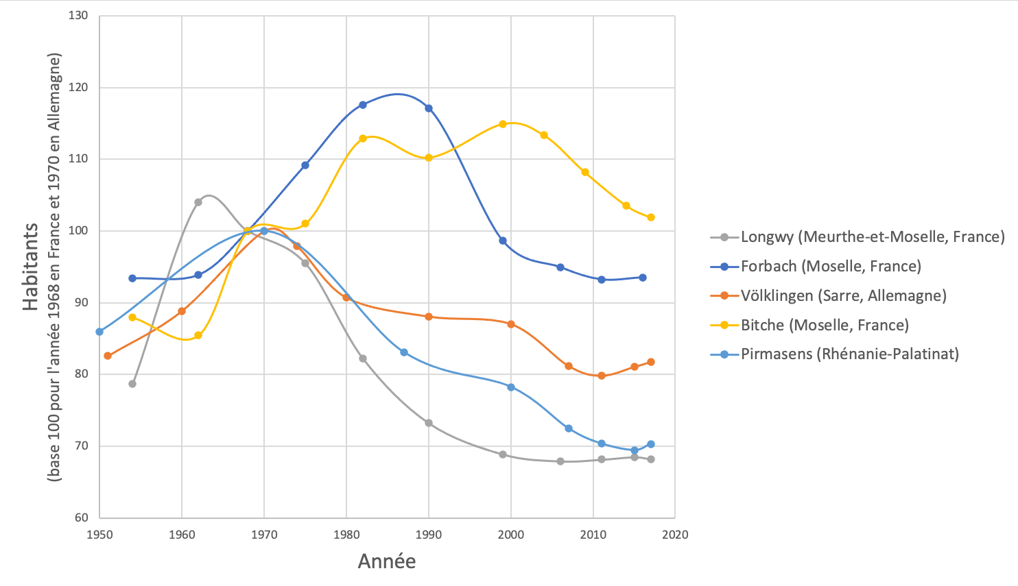 C’est dans ce contexte que s’inscrit l’article « Représentations de la décroissance urbaine de chaque côté de la frontière franco-allemande », rédigé par Frédérique Morel-Doridat, doctorante en géographie au LOTERR, Centre de recherche en géographie. Il s’appuie sur une série d’entretiens qualitatifs menés entre la France et l’Allemagne, à destination tant des acteurs politiques, économiques et de la société civile. Il s’inscrit également dans un travail plus général de questionnement des dynamiques des espaces frontaliers en Europe, en particulier de décroissance urbaine. La publication met de surcroit l’accent sur les représentations des territoires affectés par le processus ainsi que les politiques mises en place pour en limiter les effets à l’échelle des villes jumelées de Forbach (Moselle, France) et de Völklingen (Sarre, Allemagne). Bien que proches géographiquement et marquées par une histoire récente à la croisée des chemins entre annexions, aciéries et charbonnage, elles demeurent encore aujourd’hui éloignées sur le plan politique malgré l’importance de la coopération transfrontalière et des flux journaliers. Elles offrent ainsi à voir une réelle diversité des représentations associées aux processus mais aussi des réponses territoriales liées, cela à seulement dix kilomètres par les réseaux, cinq à vol d’oiseau.